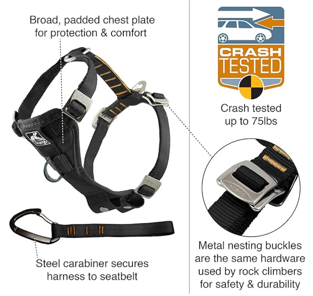 Kurgo Tru-Fit Smart Harness with Seat Belt Tether – Crash-tested up to 75 lbs, includes car seat tether, and doubles as a walking harness.