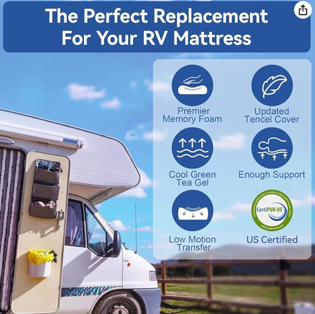 Zinus Green Tea Memory Foam RV Mattress – Affordable, lightweight, and ideal for part-time travelers who want easy installation and great value.